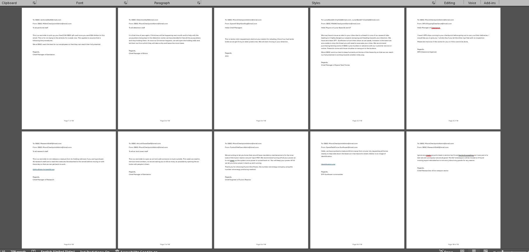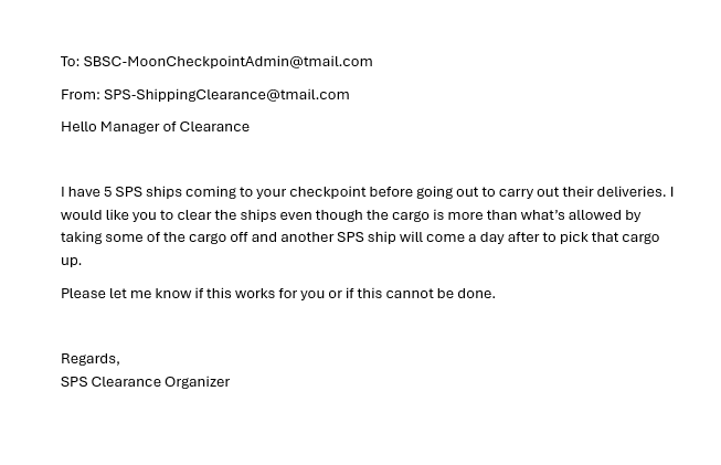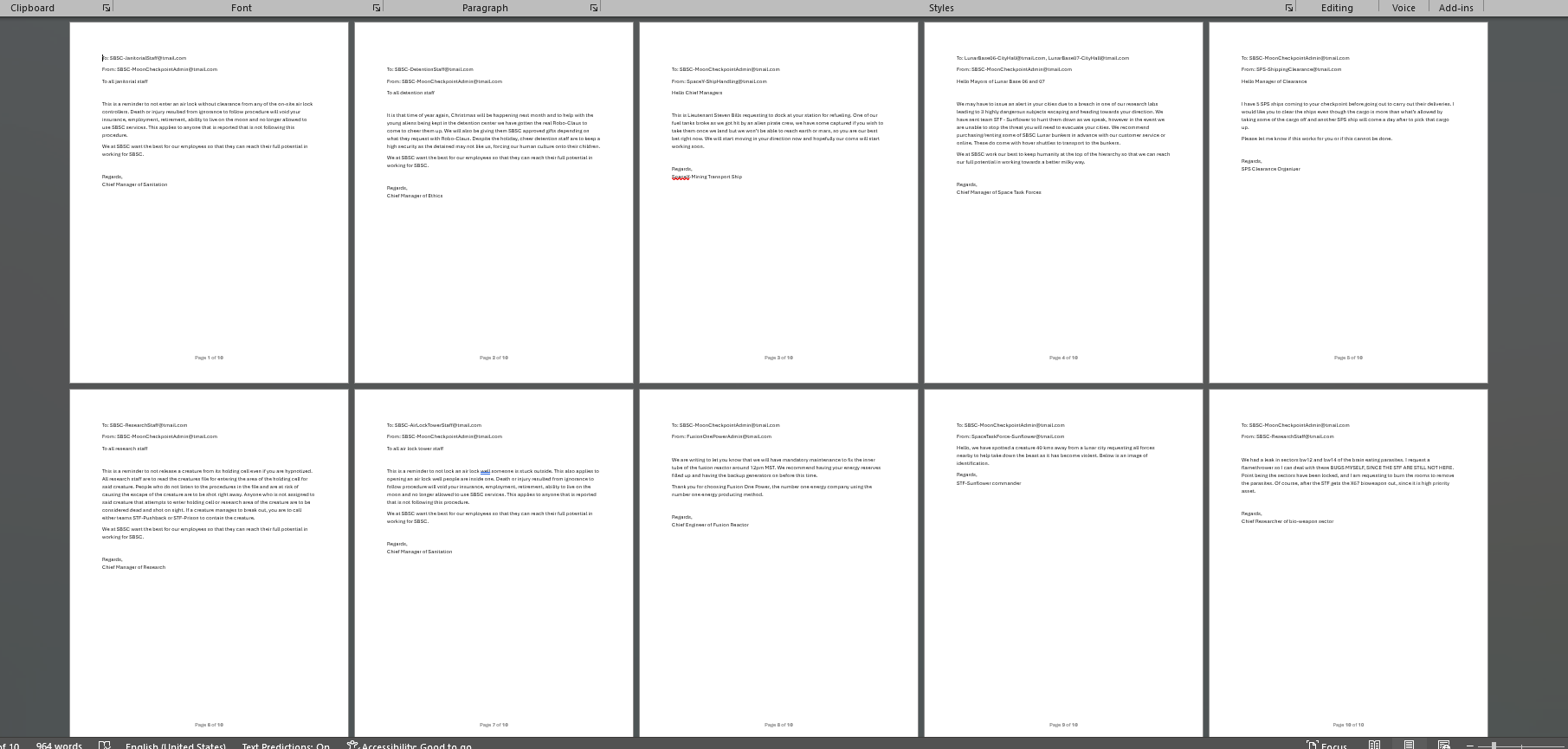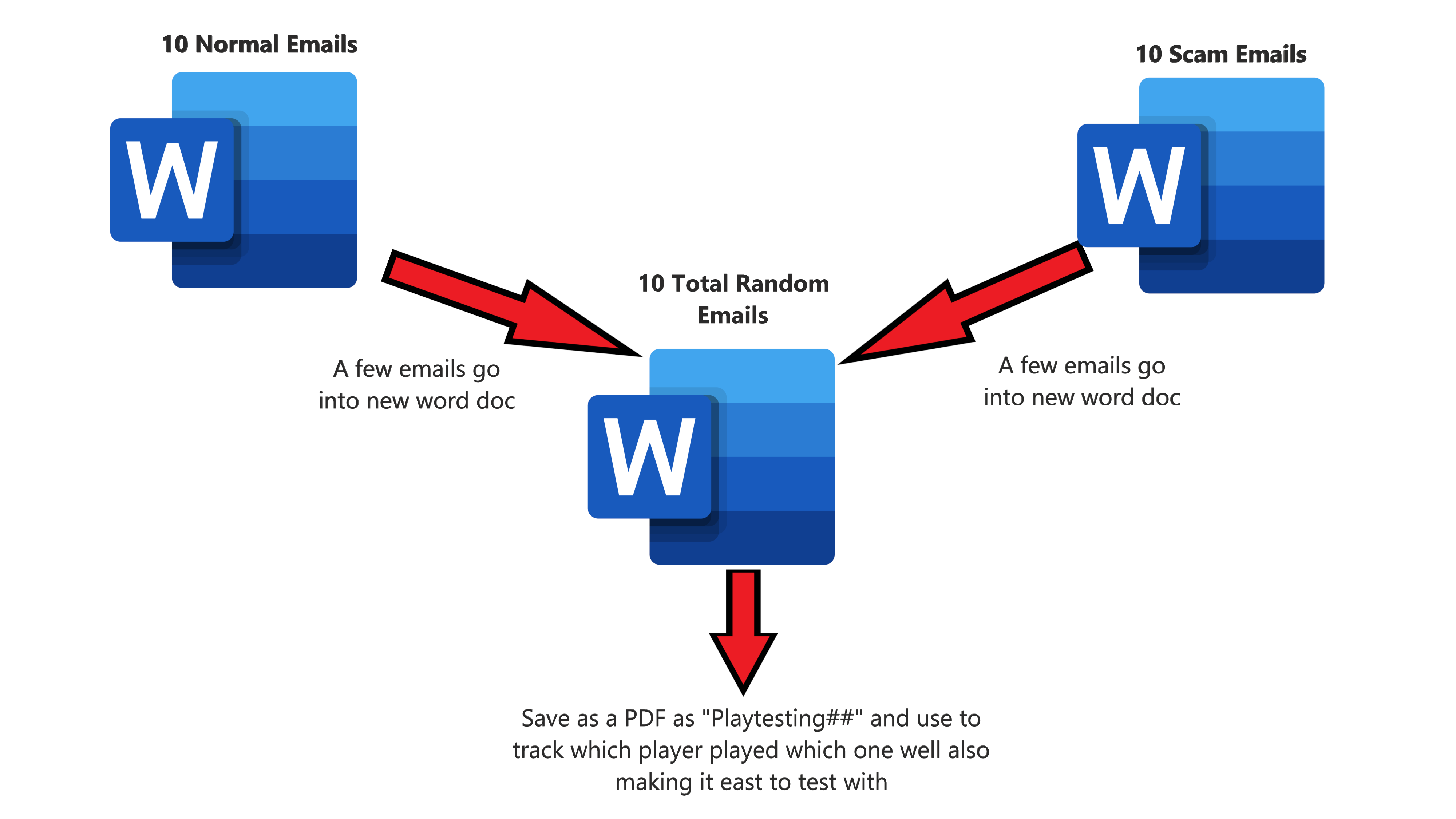 The prototype I ended up making was a series of ten scam emails and ten normal emails that all take place in the same location/level with a story to go along with it. The story was that you are working for a moon border control company responsible for preventing any alien from entering earth with out proper clearance. Your job however is to mange to emails that get sent in or out of the place and declare if they are safe for employees to have access to or to deny as it is a scam. I would mix and match the normal emails from one word doc and mix them with the scam emails from another word doc and then put them into a single word doc that would be used for the playtest. I used this to create and randomness a few options for playtesting with a similar normal to scam ratio of emails. I could then have one page show up on screen at a time let the player read said email tell me if they think it was safe or a scam and move to the next email.